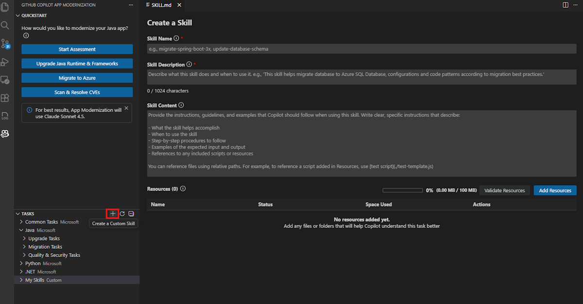 Este guia de início rápido mostra como criar e aplicar suas próprias habilidades personalizadas ao utilizar a modernização do GitHub Copilot.