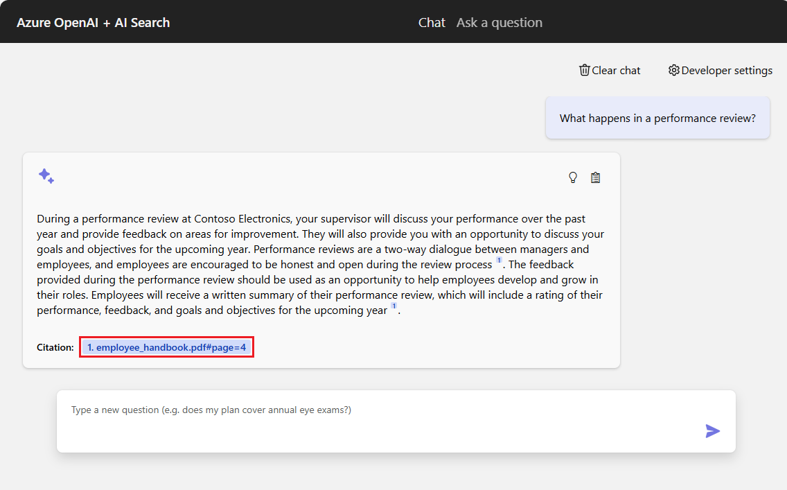 Sem o classificador semântico: "Durante uma revisão de desempenho na Contoso Electronics, seu supervisor discutirá seu desempenho no último ano e fornecerá comentários sobre áreas de melhoria. É um diálogo bidirecional onde você é encorajado a ser honesto e aberto (1). Os comentários fornecidos durante a revisão devem ser positivos e construtivos, visando ajudá-lo a desenvolver e crescer em sua função. Você receberá um resumo escrito da revisão, incluindo uma classificação de desempenho, comentários e metas para o próximo ano (1)."