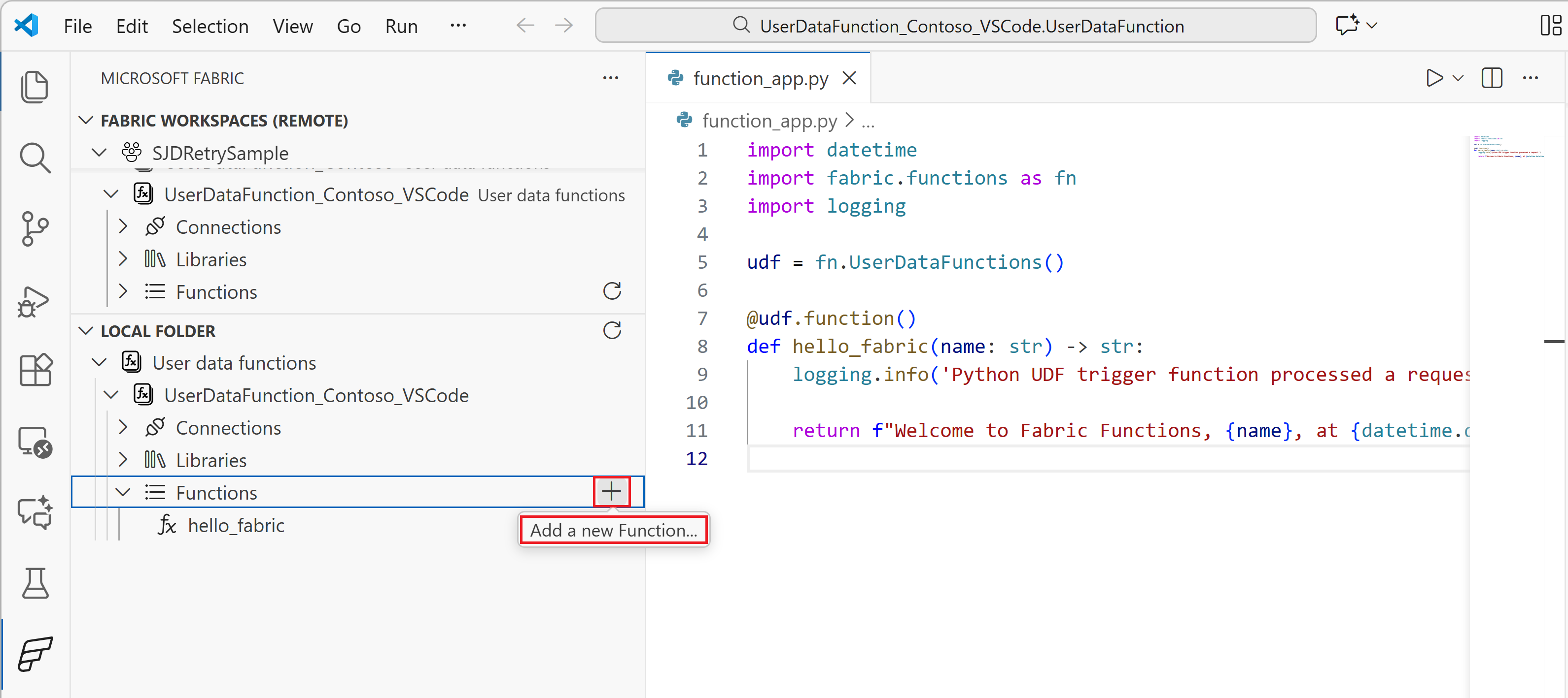 function_app.pypara ver a função padrãohello_fabric. Você pode modificar essa função ou adicionar mais funções.@udf.function() def hello_fabric(name: str) -> str: # Use logging to write custom logs to help trace and debug issues logging.info('Python UDF trigger function processed a request.') logging.info('Executing hello fabric function.') return f"Welcome to Fabric Functions, {name}, at {datetime.datetime.now()}!"