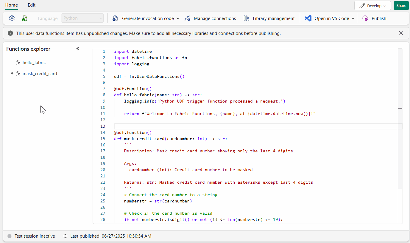 O portal do Fabric fornece recursos para testar e validar as alterações de código do User Data Functions antes da publicação. Você pode testar código não publicado no modo Desenvolver ou validar funções publicadas no modo Somente Execução. Para testes locais, você pode usar a extensão vs code.