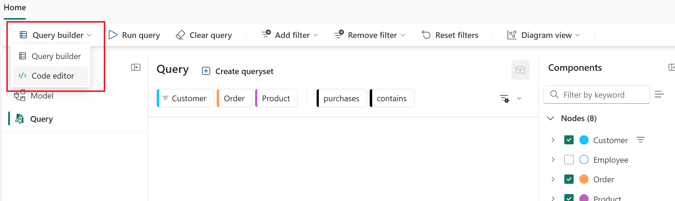Siga estas etapas para alternar para o editor de código e começar a consultar seu grafo usando GQL: