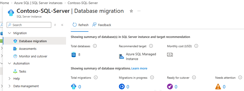 A captura de tela a seguir mostra os blocos no painel Database migration para sua instância de SQL Server no portal Azure: