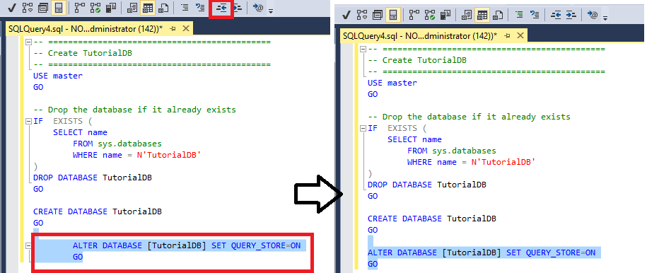 USE master; GO --Drop the database if it already exists IF EXISTS (SELECT name FROM sys.databases WHERE name = N'TutorialDB') DROP DATABASE TutorialDB; GO CREATE DATABASE TutorialDB; GO ALTER DATABASE [TutorialDB] SET QUERY_STORE = ON; GODestaque a seção Alter Database do texto e selecione o botão Aumentar Recuo na barra de ferramentas para mover o texto destacado para a direita: