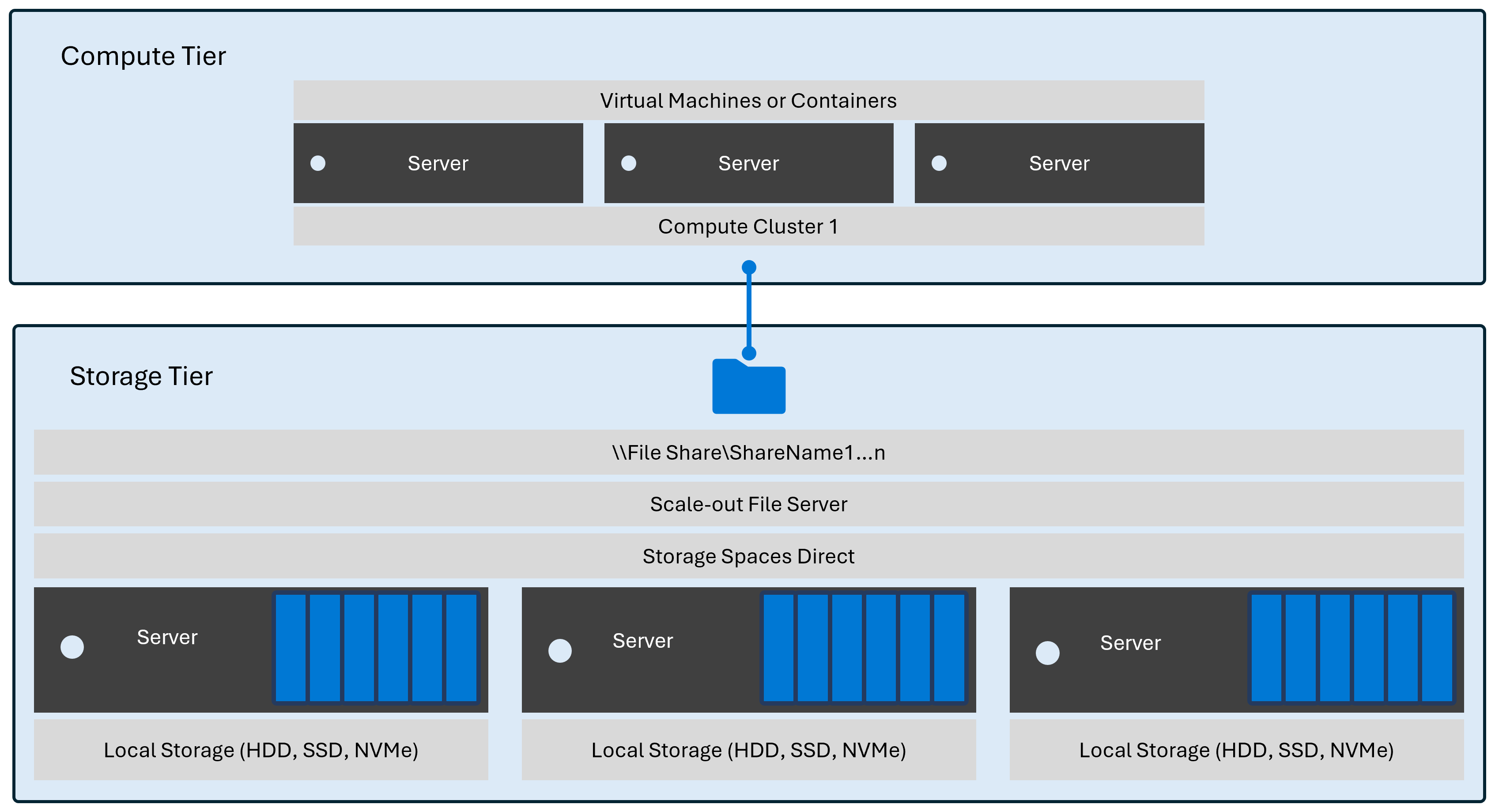 Com o Windows Server em uma configuração desagregada usando o armazenamento SAN ou NAS, você instala Hyper-V em um cluster em que as VMs acessam seu armazenamento pela rede.