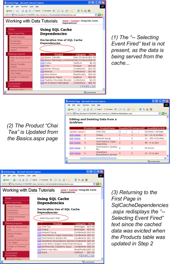 Depois de configurar o ObjectDataSource para suportar o cache, revisite a página através de um navegador. Novamente, o texto "Selecionando evento disparado deve aparecer na primeira visita à página, mas deve desaparecer ao paginar, classificar ou clicar nos botões Editar ou Cancelar. Isso ocorre porque depois que os dados são carregados no cache de ObjectDataSource, eles permanecem lá até que as Products tabelas ou Categories sejam modificadas ou os dados sejam atualizados por meio do GridView.