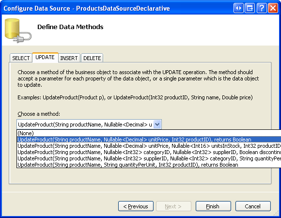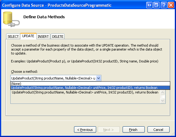 Configure o ObjectDataSource para usar a classe ProductsBLL e configure a lista suspensa na aba SELECT como GetProducts(). Na guia UPDATE, escolha a UpdateProduct sobrecarga com três parâmetros de entrada - productName, unitPricee productID. Defina as listas suspensas como (Nenhum) nas guias INSERIR e EXCLUIR.