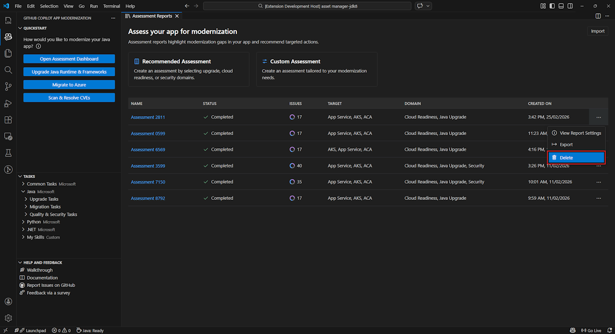 Para importar um relatório de avaliação para a modernização do GitHub Copilot, selecione Importar na página de relatórios de avaliação, ou pressione Ctrl+Shift+P e depois procure por relatório de avaliação de importação.
