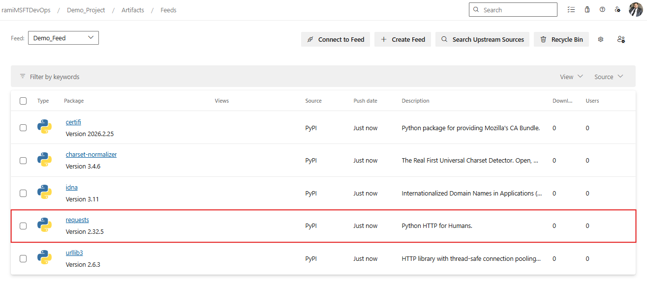 pip install requestsQuando a instalação termina, o Azure Artifacts guarda uma cópia do pacote no seu feed. Navegue até ao seu feed para verificar se a encomenda está disponível, como mostrado na captura de ecrã seguinte.