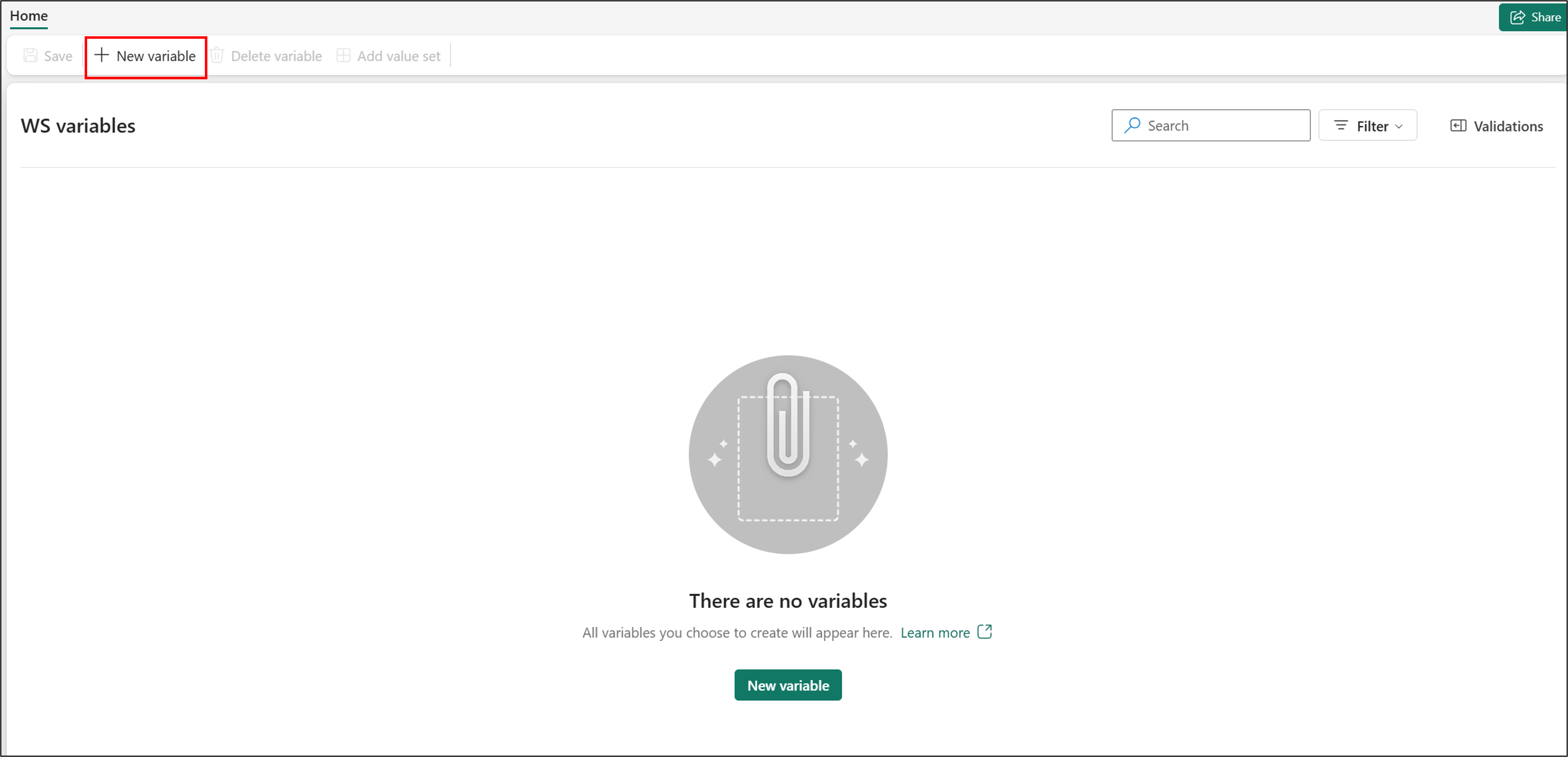Na biblioteca de variáveis WS Variables , selecione Add value set.