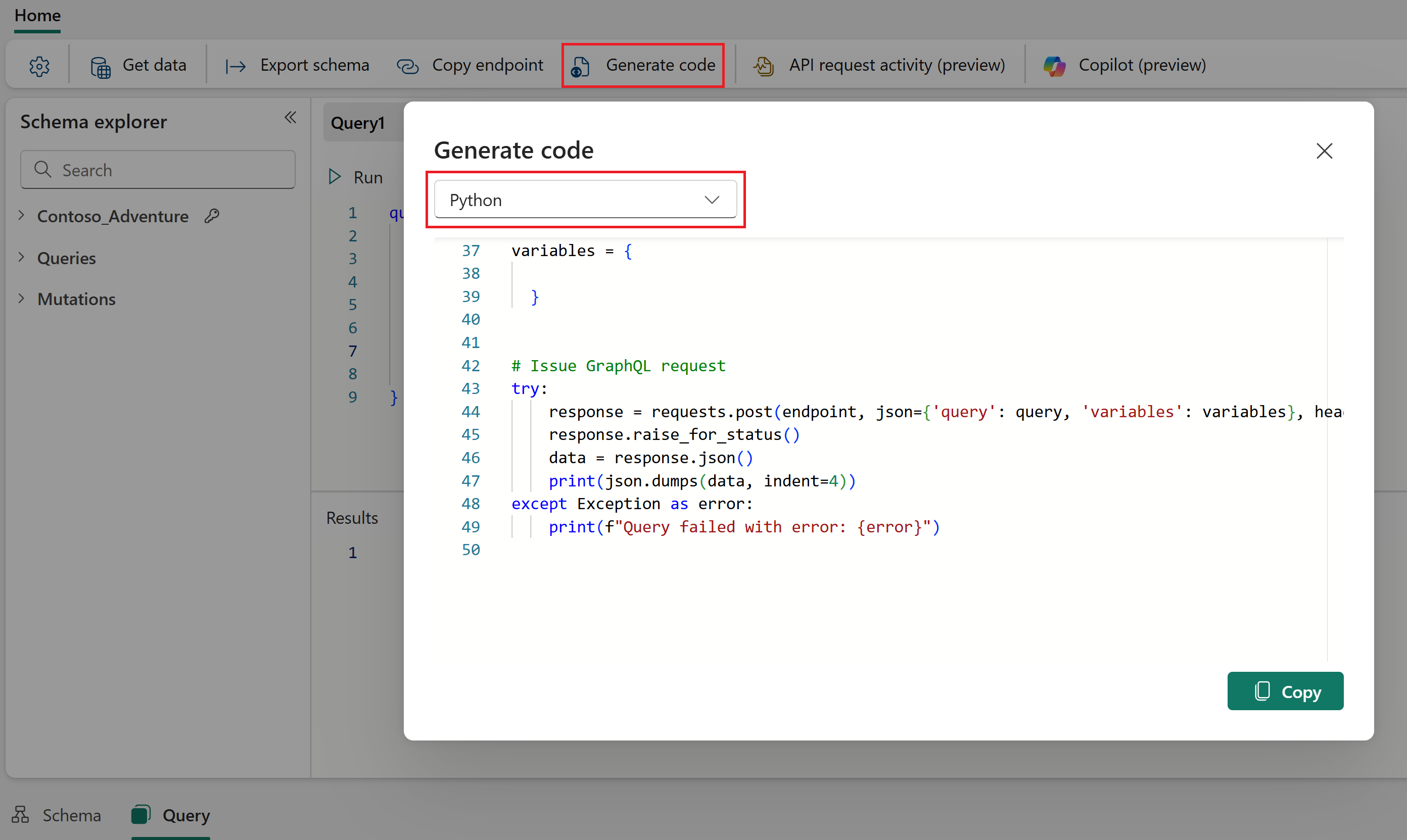 O editor de API gera automaticamente código padrão em Python ou Node.js que reflete a consulta ou mutação do GraphQL que está a testar no editor. À medida que prototipas e refinas as tuas consultas, o código gerado atualiza-se em conformidade. Quando estiver satisfeito com os resultados, pode visualizar e copiar o código gerado para executar localmente para fins de teste ou reutilizá-lo no seu processo de desenvolvimento de aplicações.