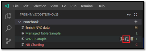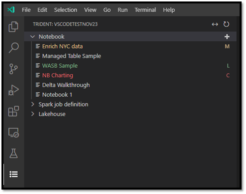 O nó da árvore do bloco de anotações lista todos os itens do bloco de anotações no espaço de trabalho atual. Com base nas alterações no VS Code, a lista exibe cores e caracteres diferentes para indicar o estado mais recente, conforme mostrado na imagem a seguir.