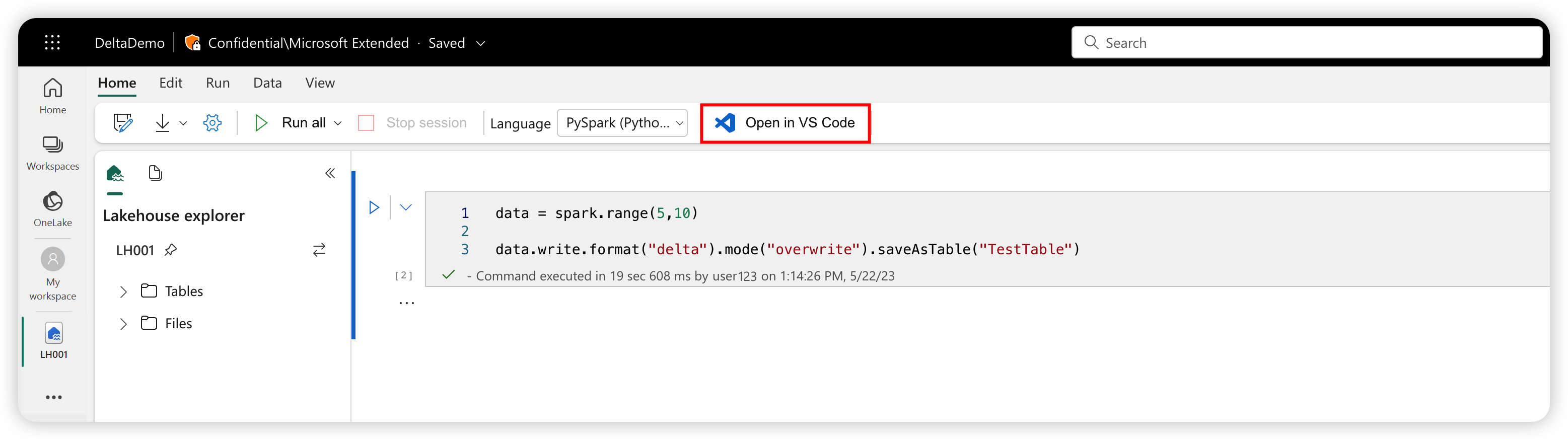 Com esta extensão, também pode executar notebooks remotamente no Apache Spark para Fabric.