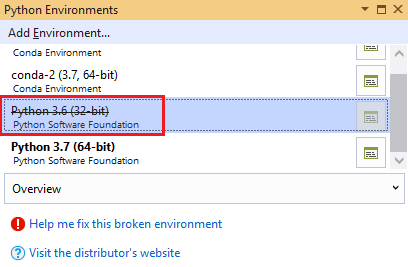 Se o Visual Studio detetar entradas do registo para um ambiente, mas o caminho para o interpretador for inválido, a janela Ambientes Python mostrará o nome do ambiente em formato de fonte riscado, conforme mostrado na imagem a seguir: