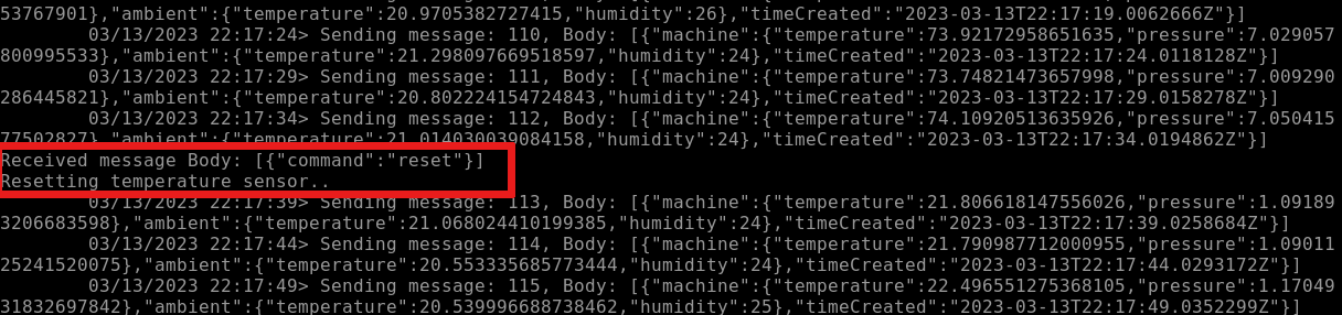 iotedge logs -f {moduleName}通过查看传感器日志,了解重置命令如何影响模拟温度传感器: