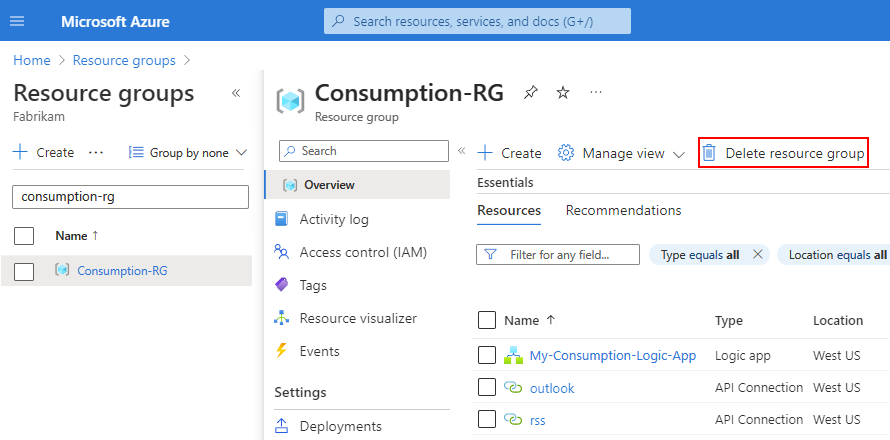 完成此快速入门后,请通过删除为此示例创建的资源组来删除示例逻辑应用资源和所有相关资源。