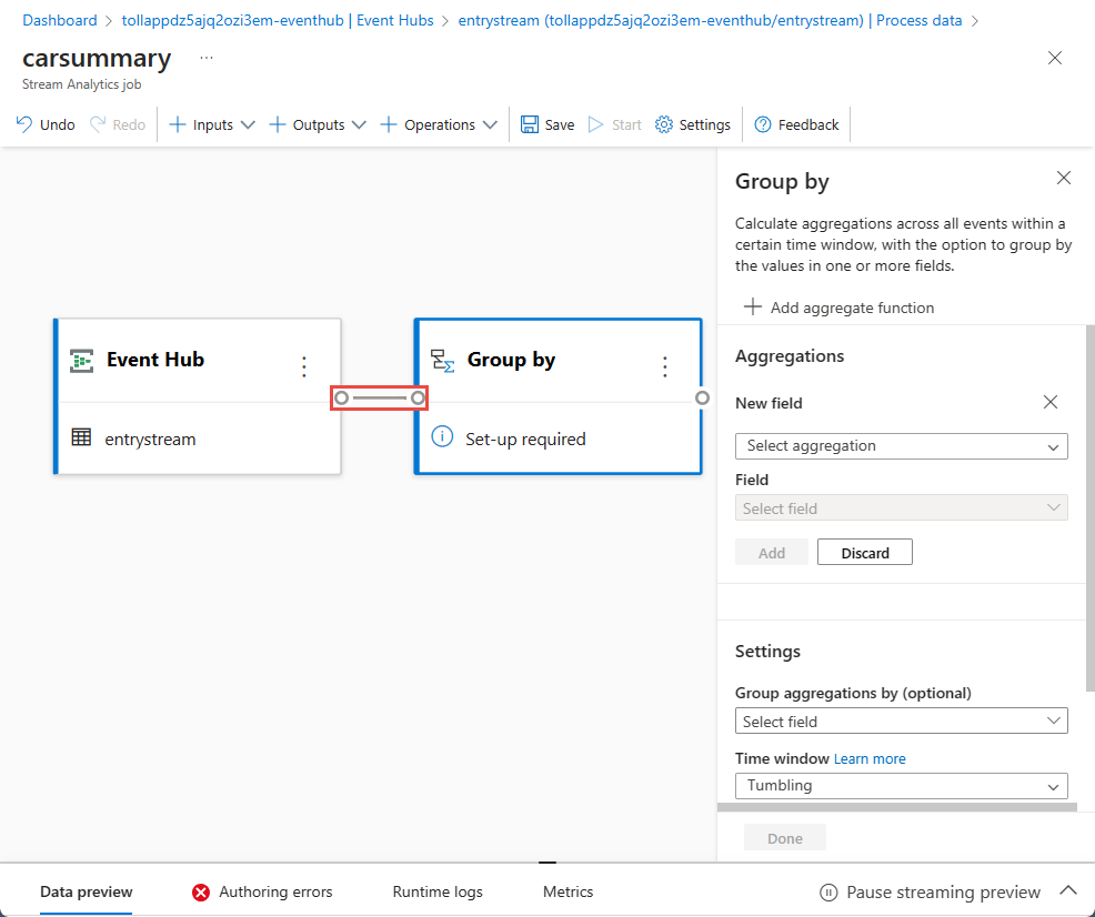 选择画布上的“分组依据”磁贴并将其连接到事件中心磁贴。