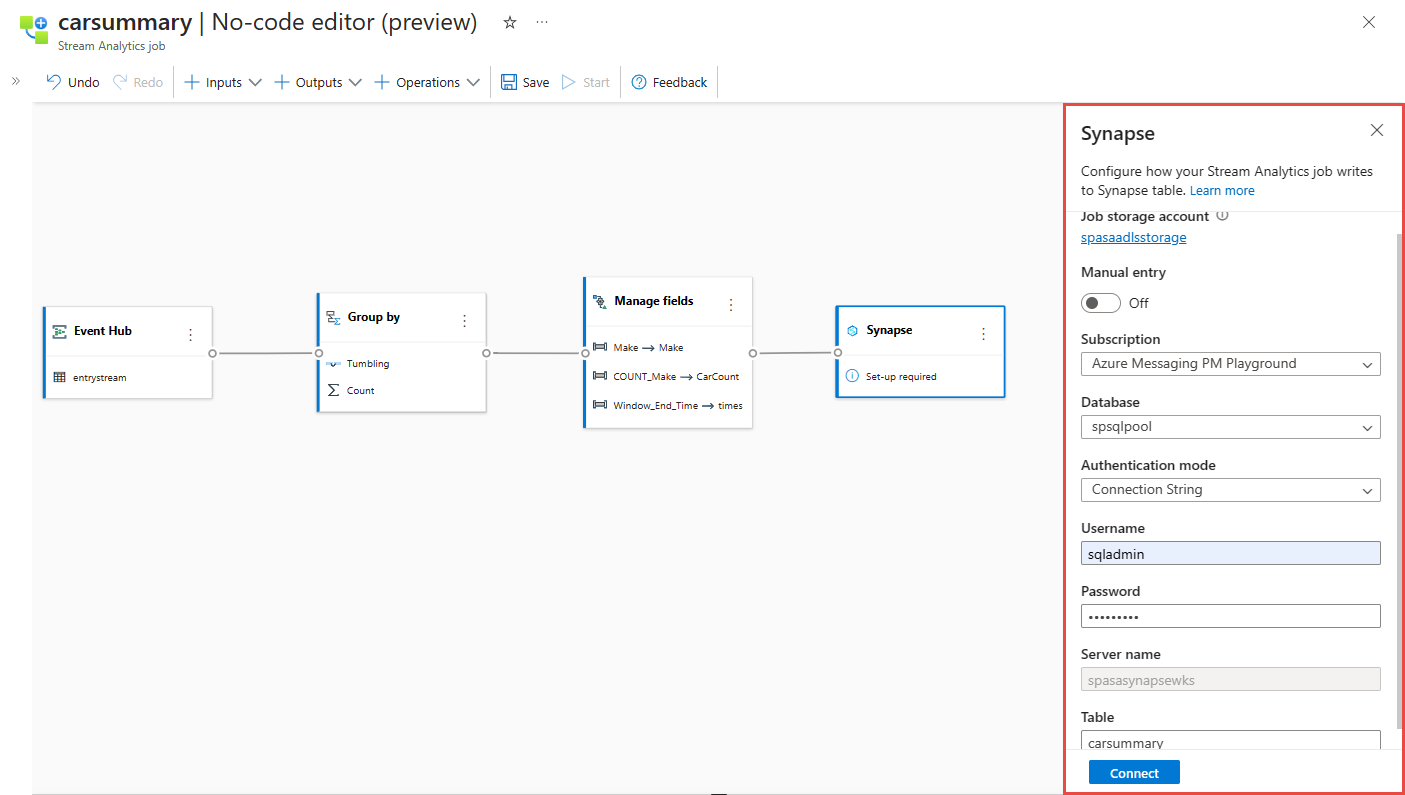 carsummary”,然后选择“创建”。在“事件中心”配置页上,确认以下设置,然后选择“连接”。