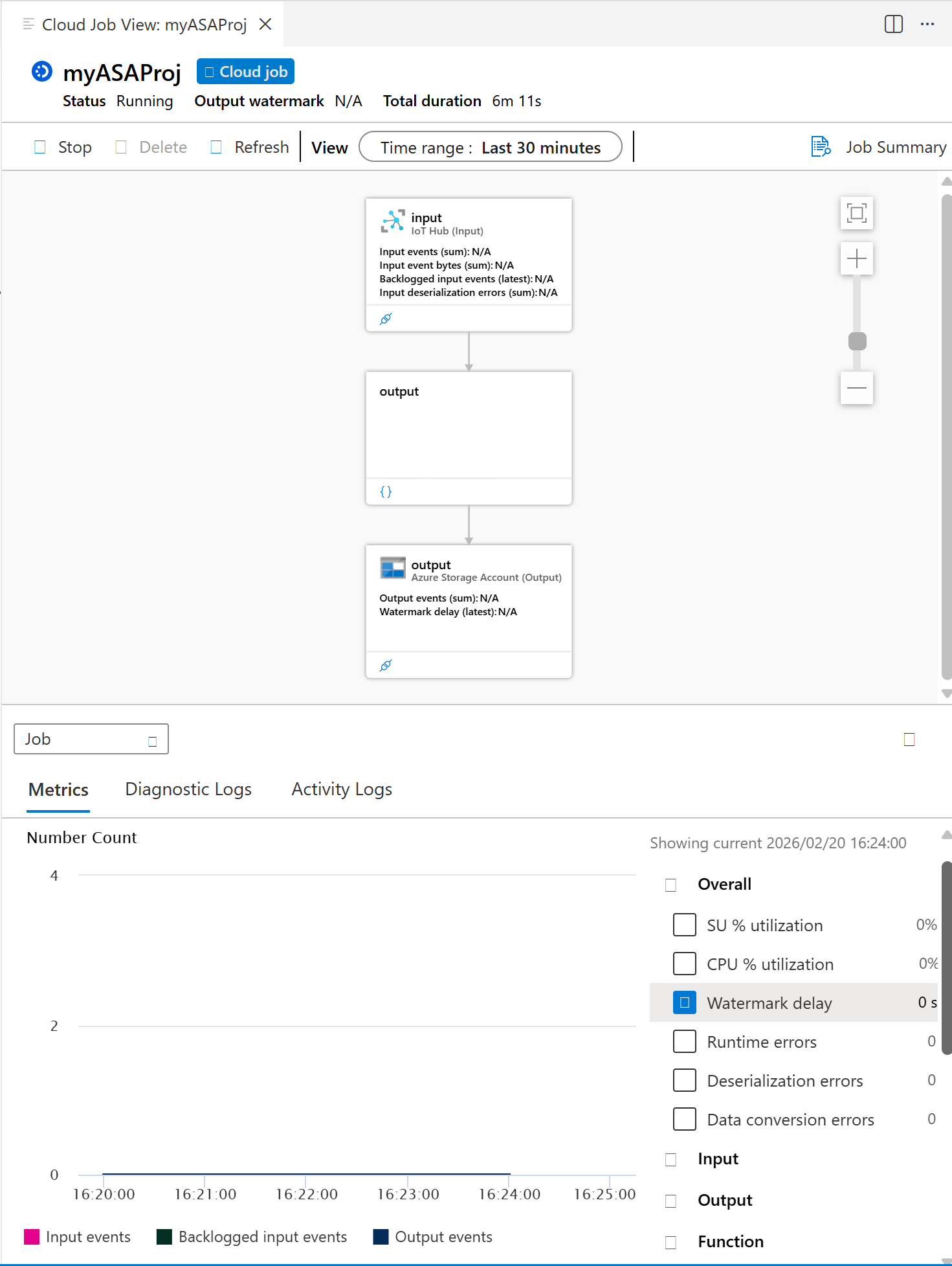 如果作业成功启动,作业状态将更改为 “正在运行”。 你会看到一个逻辑关系图,其中显示了 ASA 作业的运行方式。