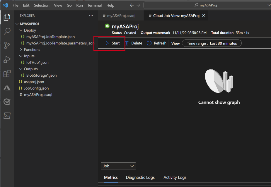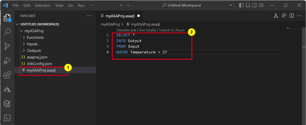 Visual Studio Code 将 ASA 项目添加到工作区。 该项目由以下三个文件夹组成:“输入”、“输出”和“函数”。 它还具有查询脚本 (*.asaql)、JobConfig.json 文件和 asaproj.json 配置文件。
