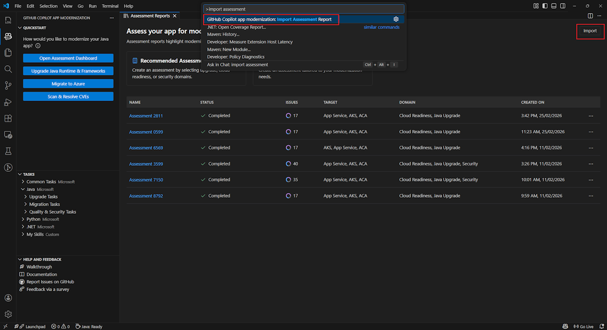 若要将评估报告导入到 GitHub Copilot 现代化,请在评估报表页中选择“ 导入 ”,或按 Ctrl+Shift+P ,然后搜索 导入评估报告。