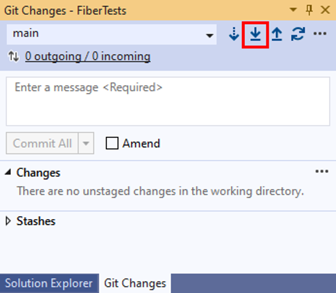 1. “Git 更改 ”窗口中,选择 “提取”。 然后选择 传出/传入 以打开 Git 存储库 窗口。