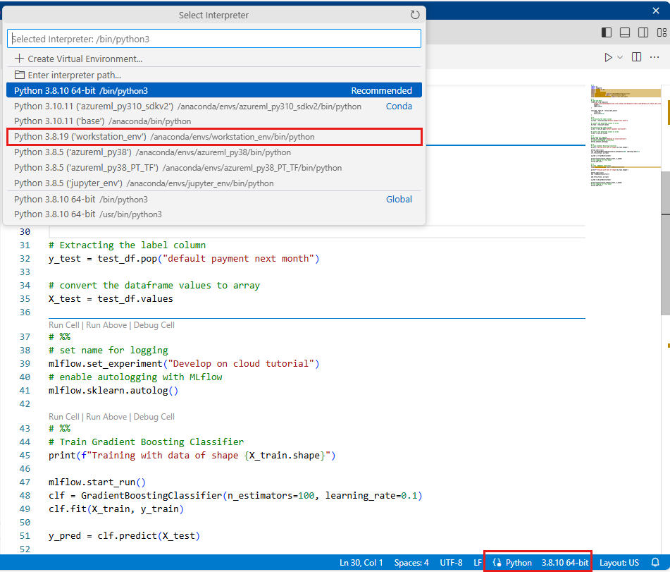 选择在本教程前面创建的环境作为 Python 版本 (workstations_env)。 在笔记本的右下角,你将看到环境名称。 选择它,然后在 Visual Studio Code 顶部选择环境。