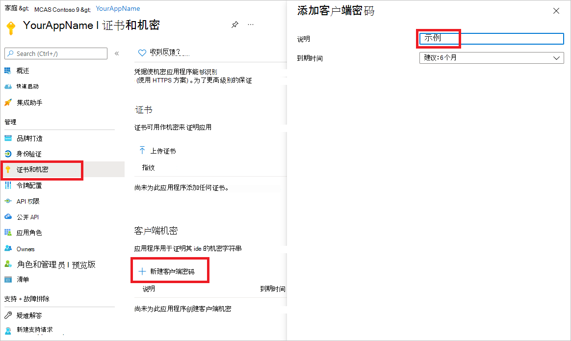 若要向应用程序添加机密,请选择“ 证书 & 机密”,然后选择“ 新建客户端密码”。 向机密添加说明,然后选择“ 添加”。