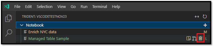 在 VS Code Explorer 中,将鼠标悬停在要删除的笔记本的名称上。选项显示在名称右侧,包括“删除笔记本”选项。