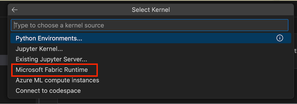 选择内核 Microsoft Fabric 运行时 ,在远程 Spark 计算上运行代码单元。