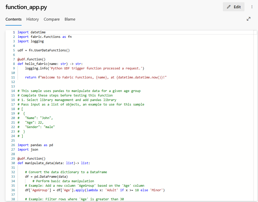 function-app.py:此文件是函数代码。 对用户数据函数项所做的任何代码更改都通过此文件同步到存储库中。 可以执行各种 Git 操作来管理代码开发周期。