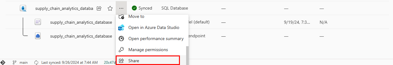 有关共享的更多信息,请参阅共享 SQL 数据库并管理权限和在 Microsoft Fabric 中共享项目。
