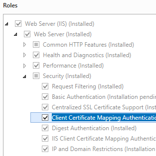 - 在“服务器角色”页上,依次展开“Web 服务器 (IIS)”、“Web 服务器”和“安全性”,然后选择“客户端证书映射身份验证”。 单击 “下一步” 。
