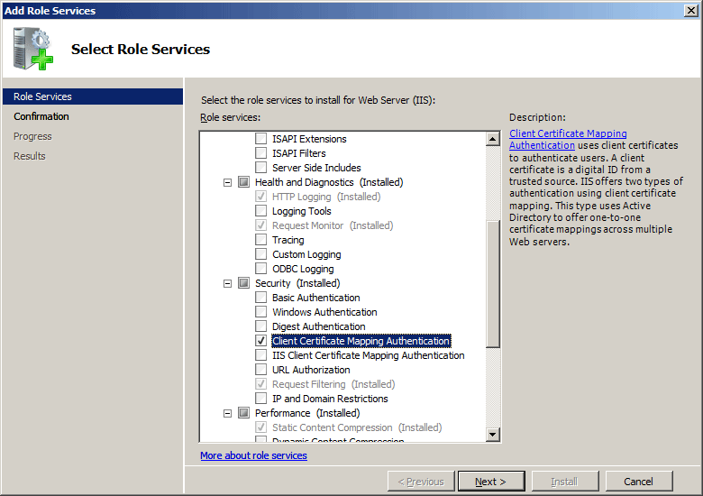- 在“添加角色服务向导”的“选择角色服务”页上,选择“客户端证书映射身份验证”,然后单击“下一步”。