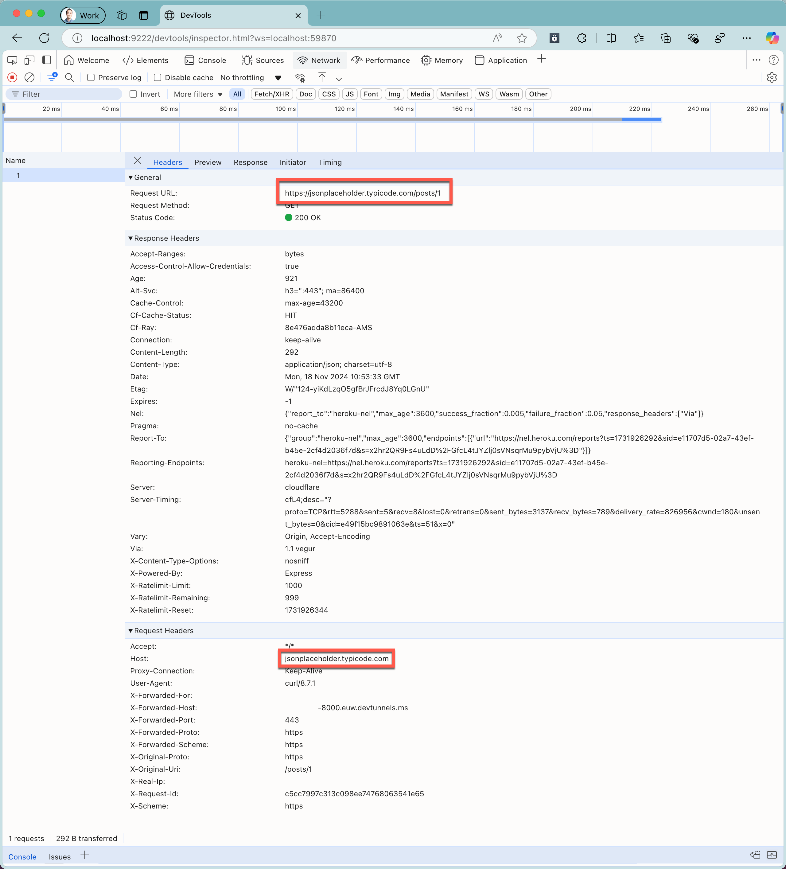curl https://tunnel_id-8000.euw.devtunnels.ms/posts/1。在使用 Chrome Dev Tools 的 web 浏览器中,请注意有关截获的请求和来自云 API 的响应的信息。