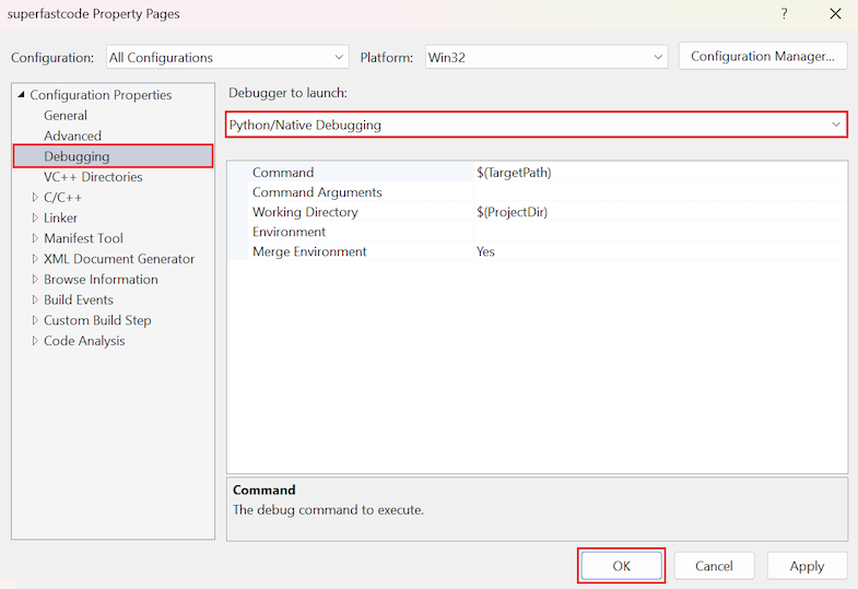 Expand the dropdown menu for the Debugger to launch option and select Python/Native Debugging.